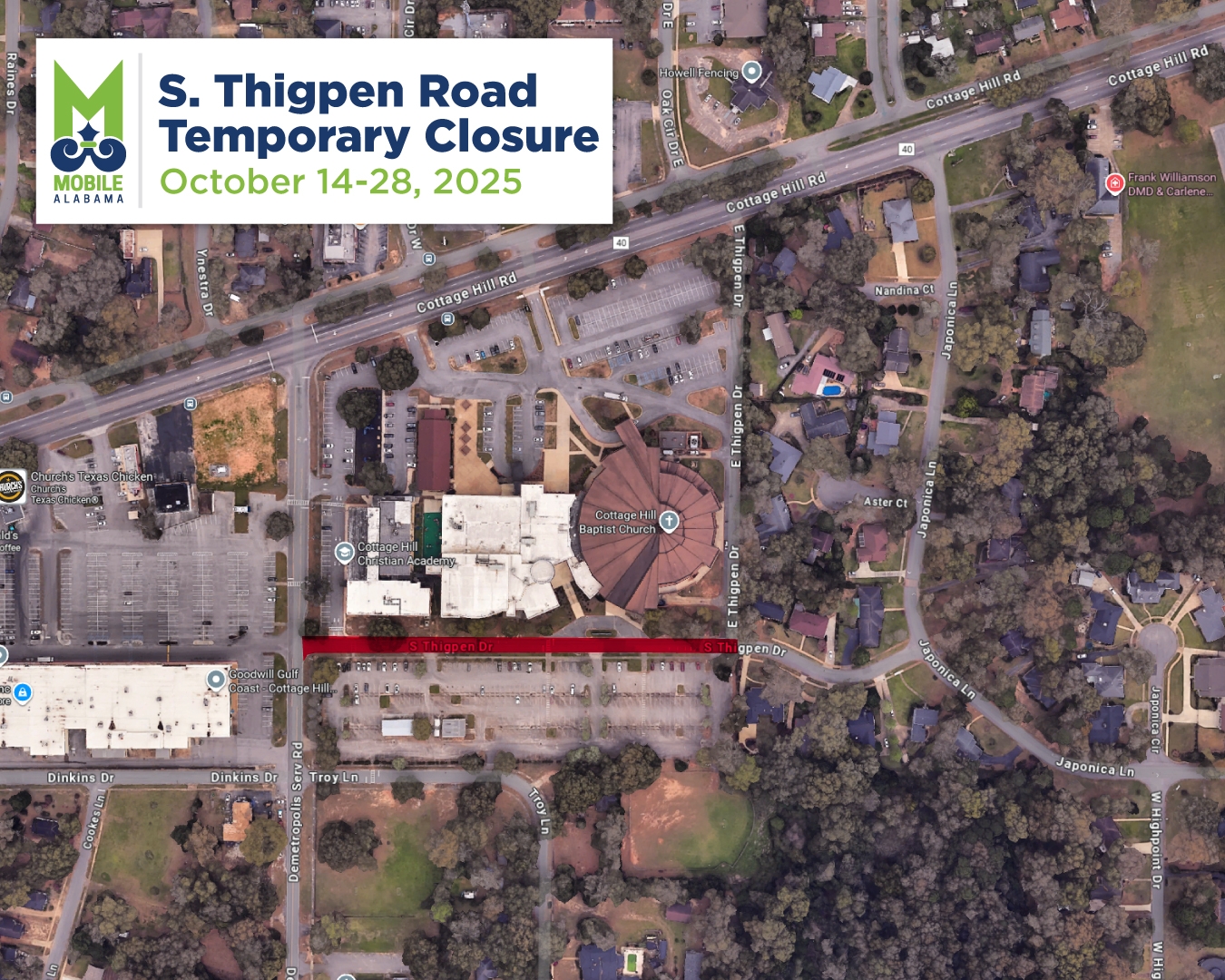Mobile, Ala. — The City of Mobile will temporarily close S. Thigpen Drive between Demetropolis Road and E. Thigpen Drive beginning Tuesday, October 14, as part of an ongoing traffic study.