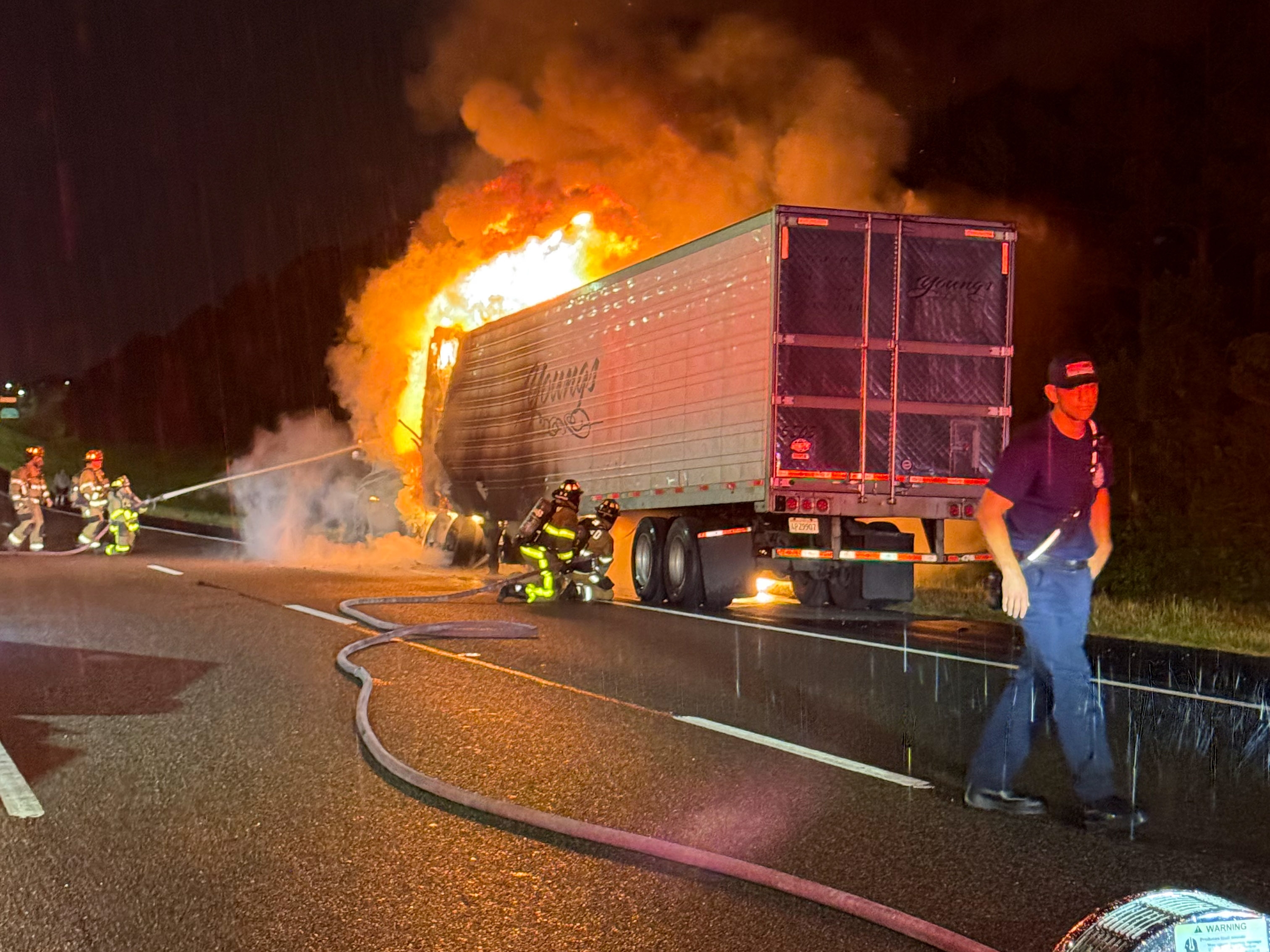 Firefighters from Engines 2 and 16 arrived on scene to find an 18-wheeler tractor-trailer with heavy fire showing from the rear of the cab and the front of the trailer. The driver and occupant were safely outside the vehicle.