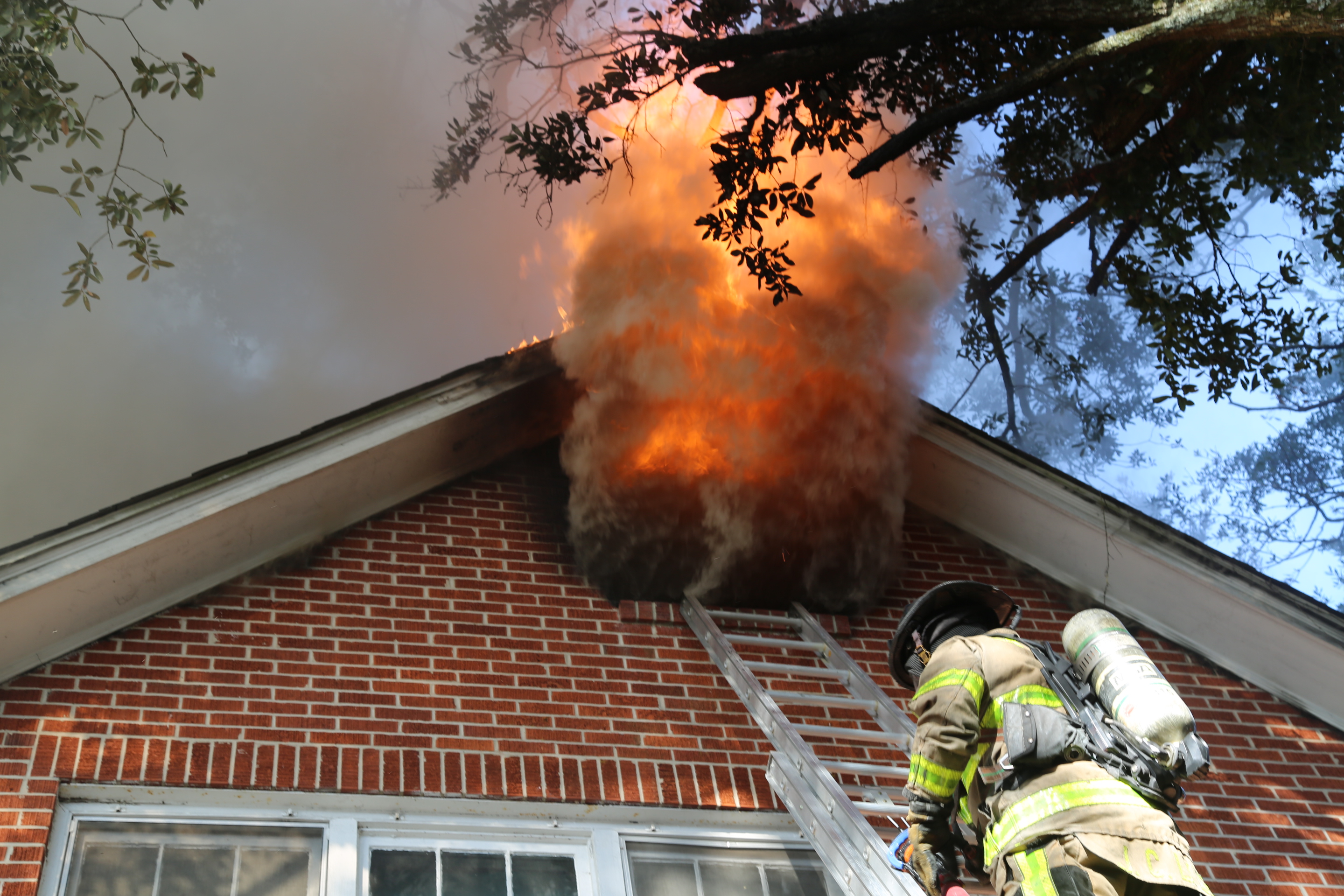 Upon arrival on scene, fire personnel discovered a 2-story, brick residence presenting with flames breaking through the roof and thick, black smoke billowing from the upper floor and attic.