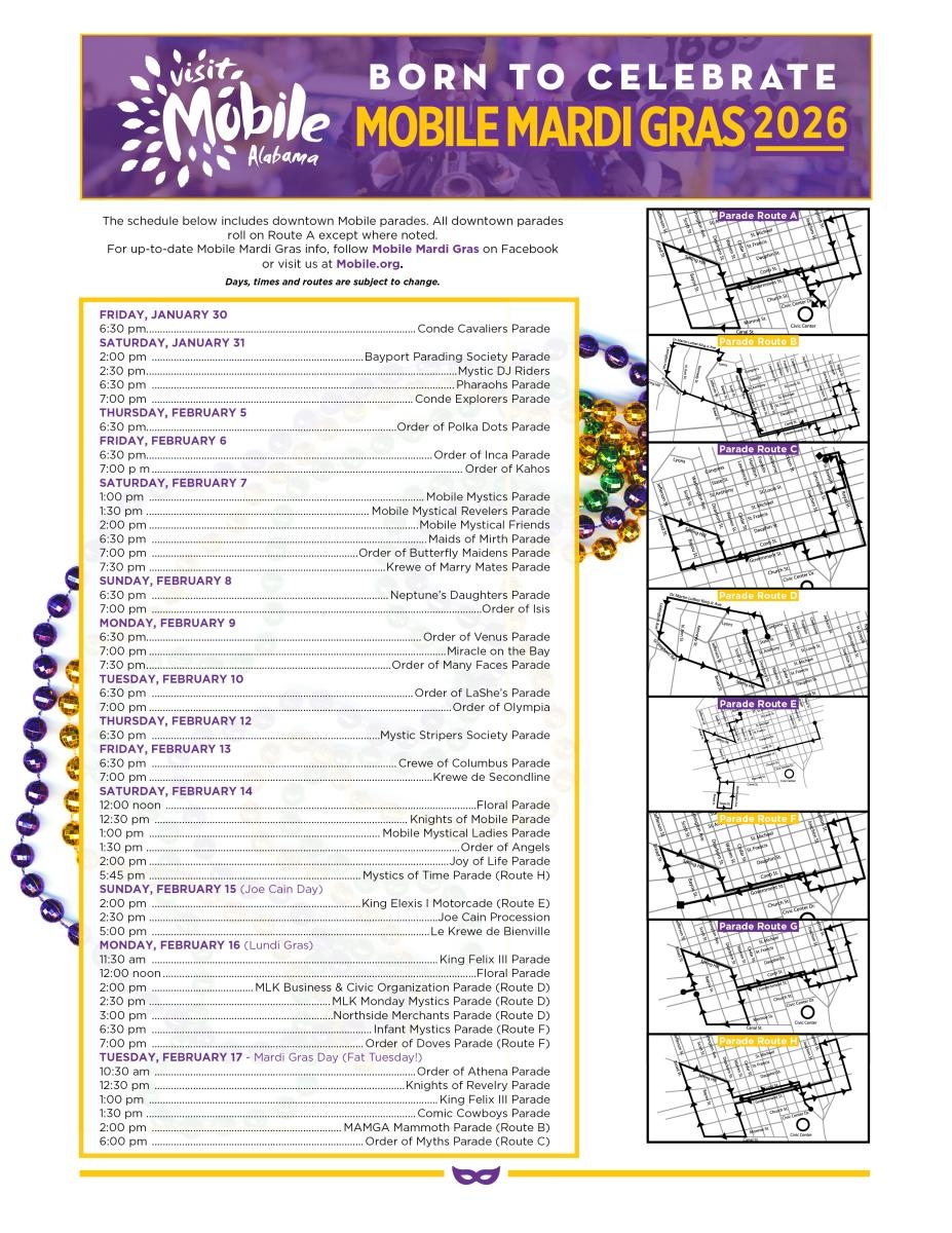 Thank you to our friends at Visit Mobile for compiling a list of the parade schedules and their corresponding route maps!