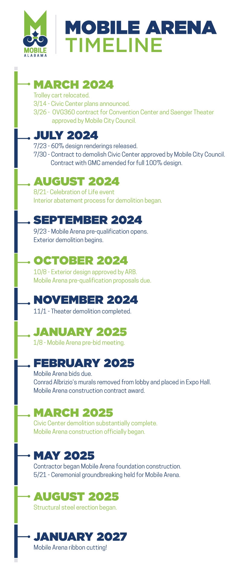 After years of planning and feedback from local stakeholders, the City of Mobile has torn down the obsolete Mobile Civic Center and began constructing a world-class entertainment arena suited for concerts, family shows, and sporting events of all kinds.