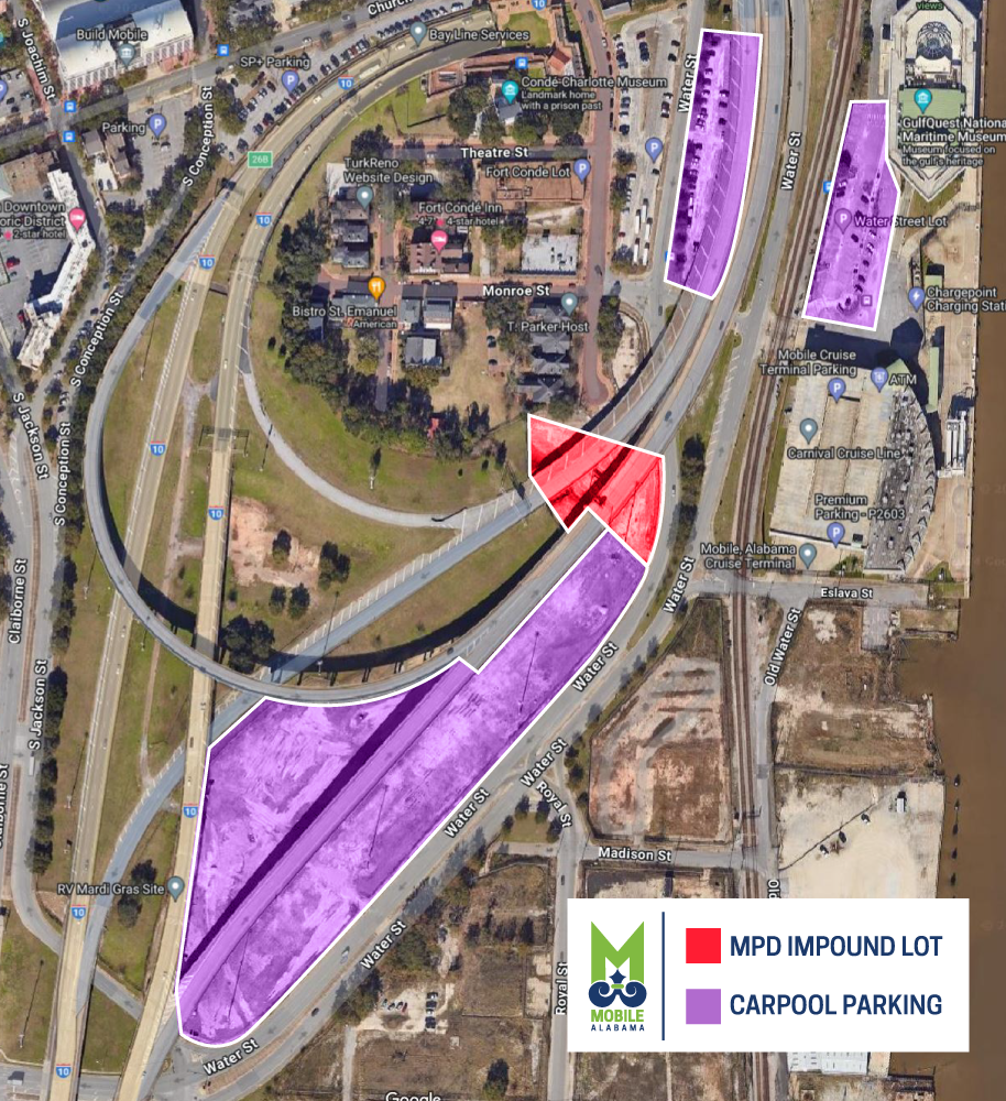To encourage carpooling, the City of Mobile is also offering discounted carpool rates in these lots to vehicles with three or more passengers. These areas will be staffed and operated by Premium Parking on behalf of the City of Mobile. Staff will be onsite to direct motorists to any available parking. Please note that parking availability could be impacted on cruise days and during planned events at GulfQuest.