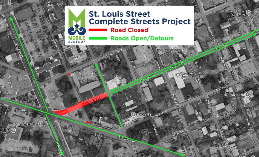 We will continue to work closely with businesses and residents to provide updates and address issues as they arise. Please note that the businesses along the corridor are open and will remain open throughout the project. We ask that Mobilians continue to support them through the project. For more information on St. Louis Street project, visit https://mapformobile.org/stlouisstreet/.