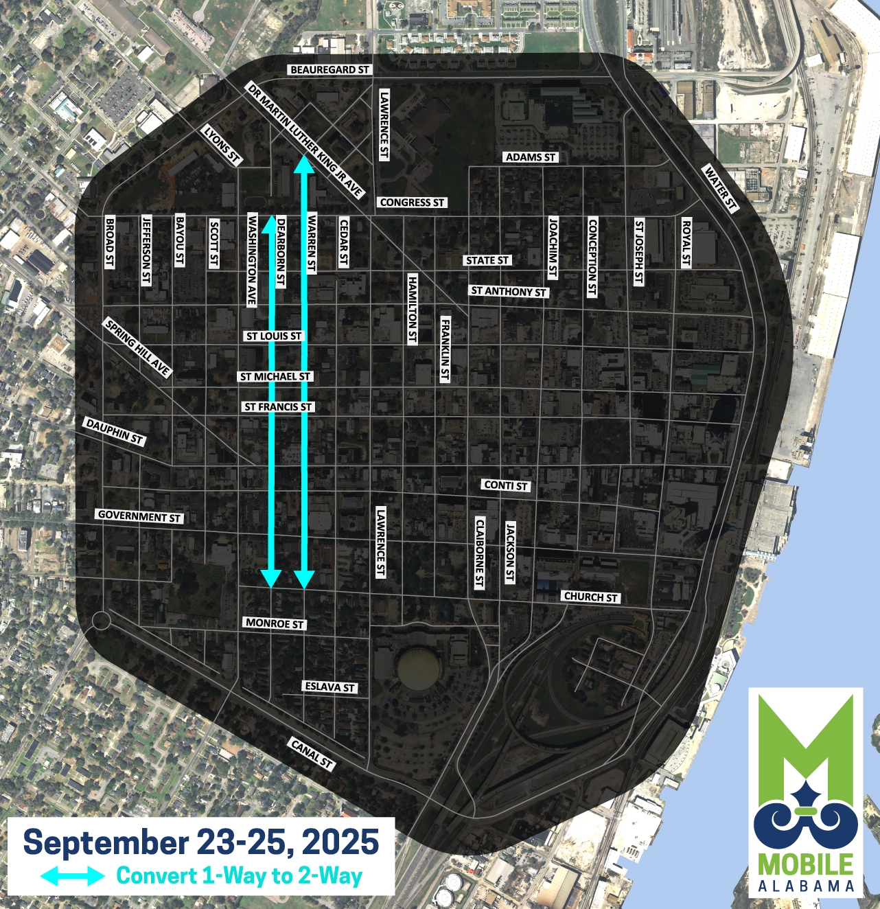 Motorists can expect the new two-way street configurations the following morning. Once converted to two-way traffic, these streets will use a yield-flow traffic model that allows traffic to safely move in both directions while still maintaining on-street parking. You can learn more about the Downtown Street Optimization project by visiting cityofmobile.org/downtown-street-optimization/.