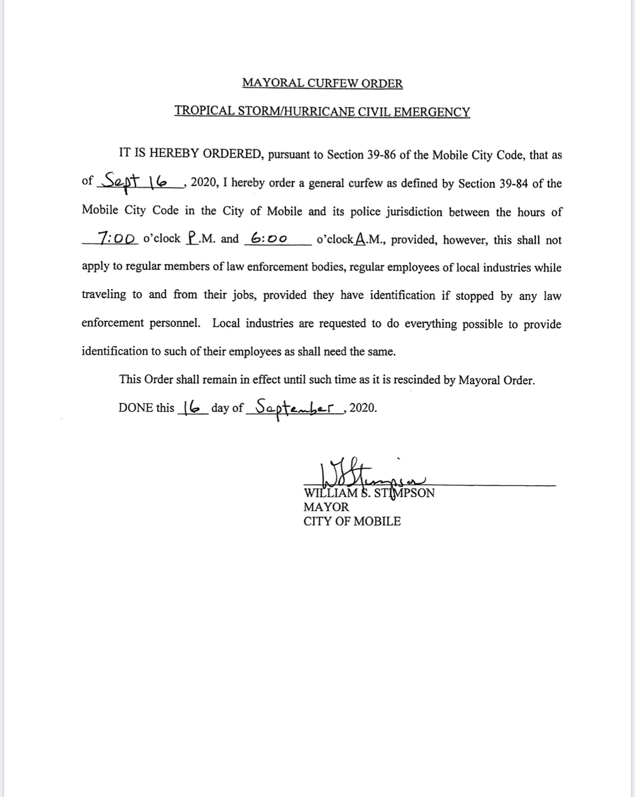 09/18/2020 – Due to power outages at several intersections, Mayor Stimpson will continue the curfew in the City of Mobile for tonight. The new curfew order will change the time to begin at 9:30 p.m. and end at 6:00 a.m. on September 19th.
