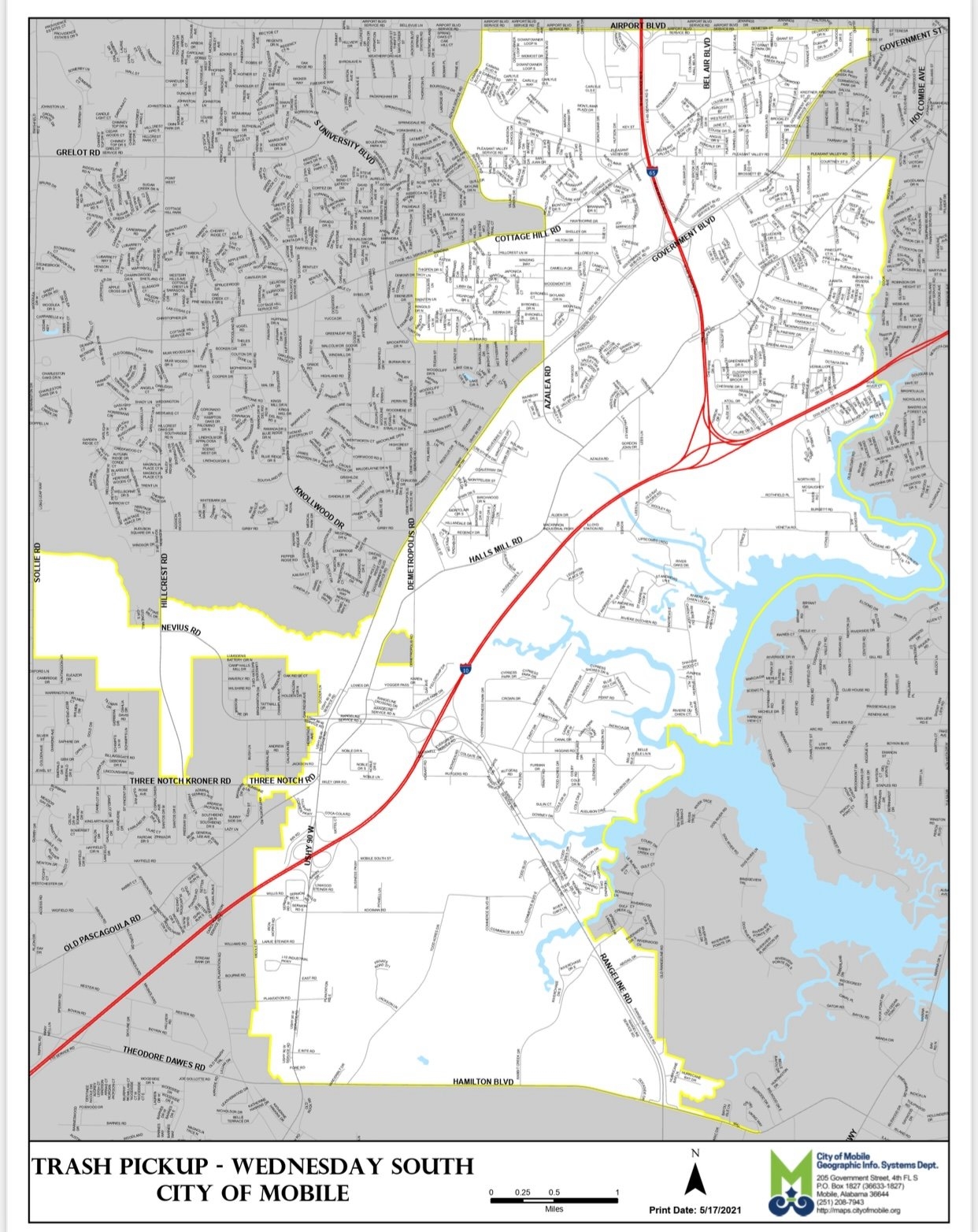 Tomorrow, Tuesday, May 25, our crews will be continuing to work through the Wednesday South routes. The areas these routes encompass are identified on the map below. Please remember that curbside trash is different from household garbage, which is collected weekly. The City has also set up drop-off points for bagged yard debris ONLY at the following locations: