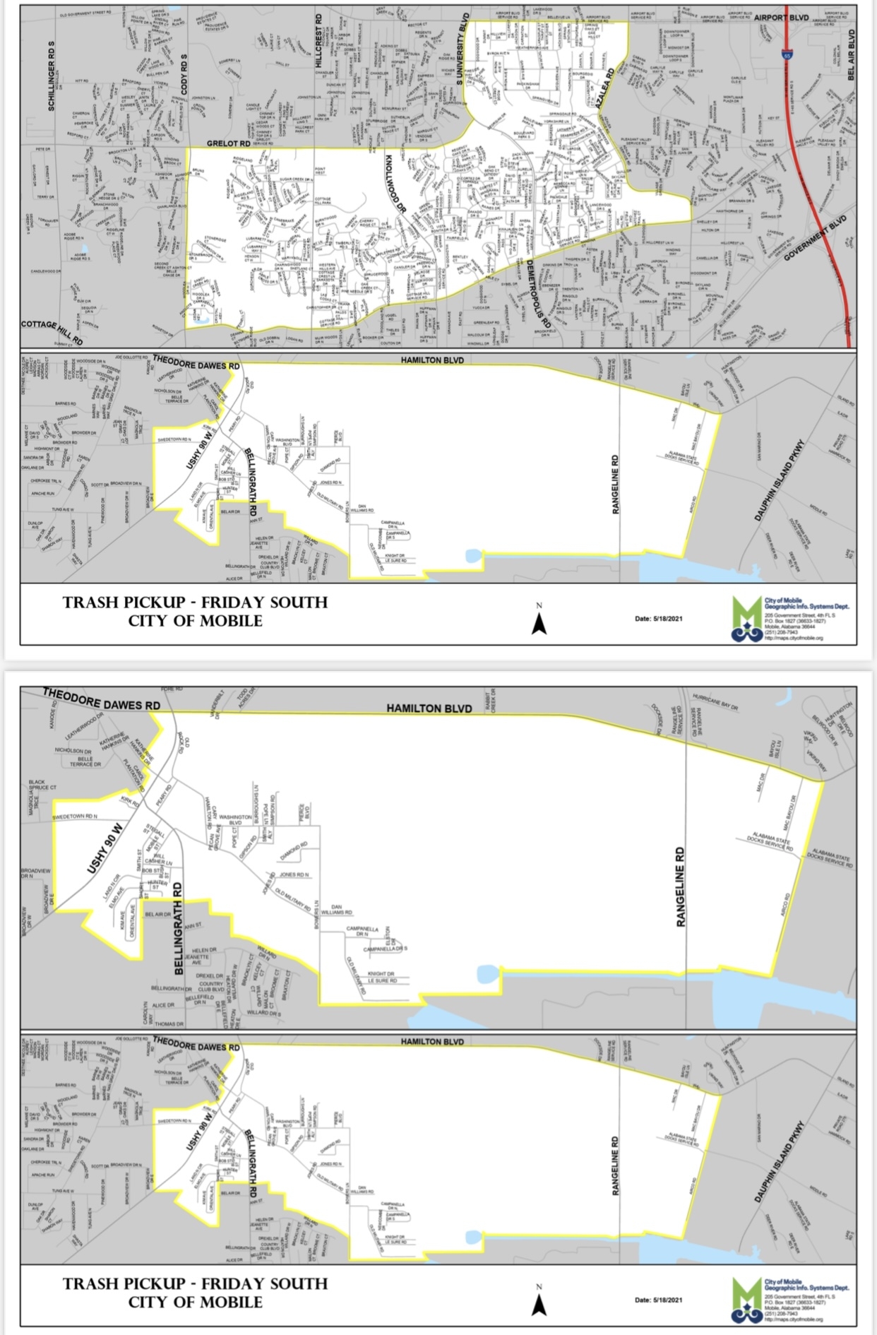 Tomorrow, Friday, May 28, our trash collection crews will be continuing to work on the Friday South routes. The areas these routes encompass are identified on the map below. Please remember that curbside trash is different from household garbage, which is collected weekly. The City has also set up drop-off points for bagged yard debris ONLY at the following locations: