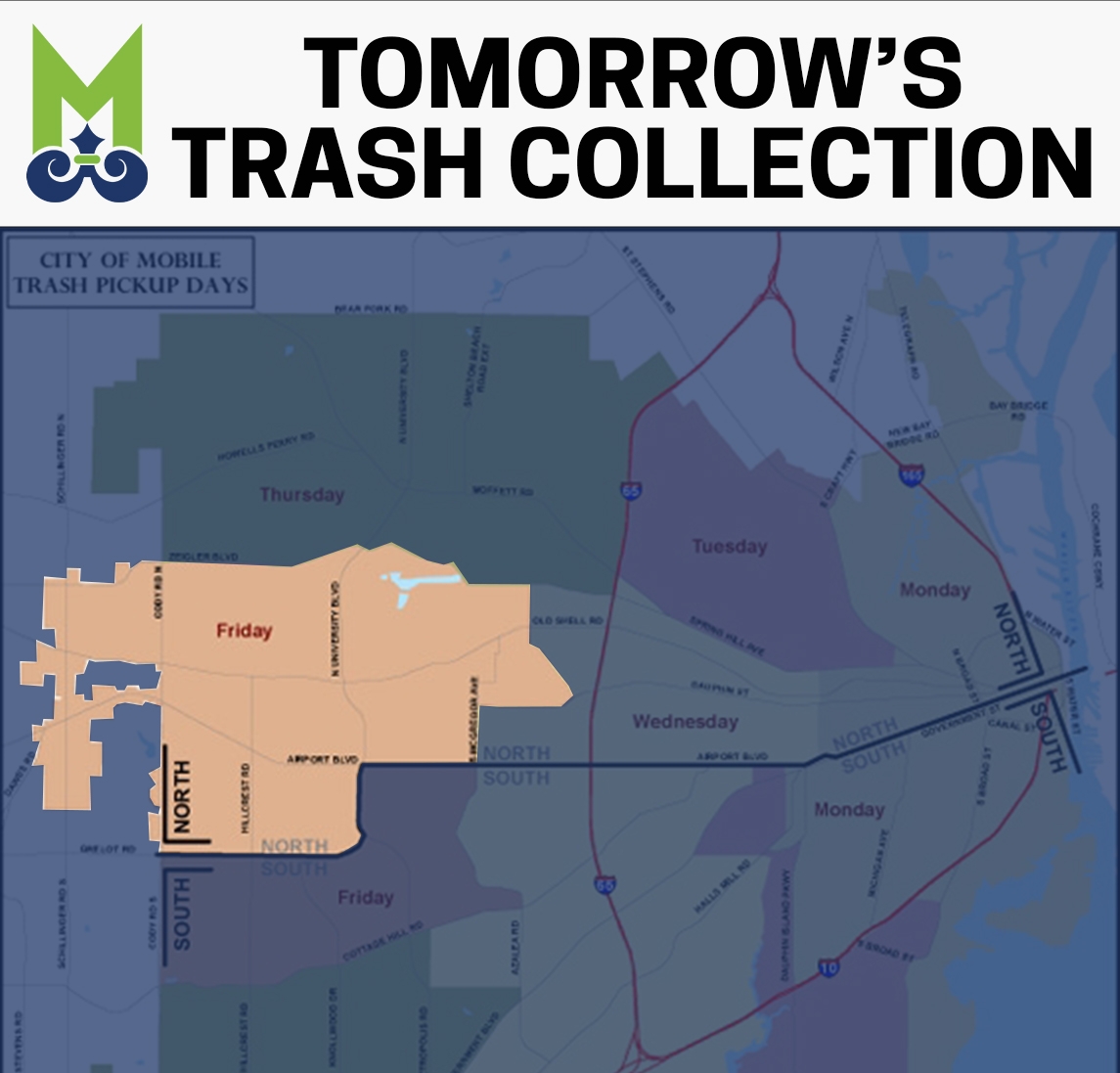 This morning our trash crews completed collection along the Thursday north routes and moved on to the Friday north routes. Tomorrow, Thursday, May 13, they will be continuing to collect along the Friday north routes. The areas these routes encompass are identified on the map below. Please remember that curbside trash is different from household garbage, which is collected weekly. The City of Mobile has also set up drop-off points for bagged yard debris ONLY at the following locations: